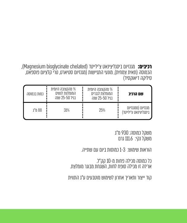 המגנזיום שלנו הוא ביסגליצינאט (Magnesium Bisglycinate Chelate) איכותי ונקי. הוא לא "מדולל" עם רכיבים זולים.